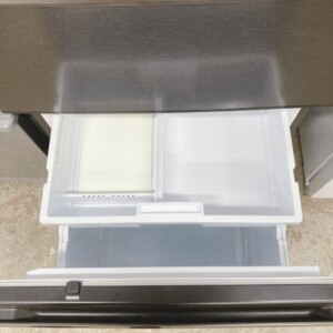 査定したMR-CD41G-Tは、外観全体としては使用感が少なくきれいな状態でした。ドア面や側面に目立つ傷やへこみはなく、庫内の棚やケースも割れなどは見られません。一方で、製氷室部分には使用に伴う軽度の使用感が確認できました。冷却機能や庫内灯、操作パネルの動作は問題なく、実用面では良好なコンディションを保っています。