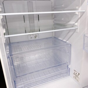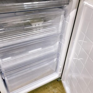 外観は大きなへこみや破損は見られなかったものの、扉表面には使用に伴う細かな擦れやくすみが確認できました。庫内については棚板やケース類は揃っていましたが、若干の使用感があり、新品同様とは言えない状態でした。冷蔵・冷凍機能は正常に動作しており、冷却性能に問題はありませんでした。