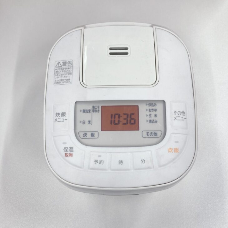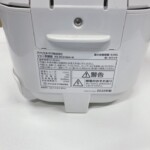 お預かりした炊飯器は、外観に目立つキズや大きな汚れは見られず、全体的にきれいな印象でした。操作パネルの表示も正常で、各ボタンの反応も問題ありません。内釜はコーティングの剥がれがなく、底面や縁部分にも焦げ付きは確認されませんでした。内ぶたや蒸気口まわりも清潔に保たれており、使用感はありますが丁寧に使われていたことが分かる状態です。電源コードも付属していました。