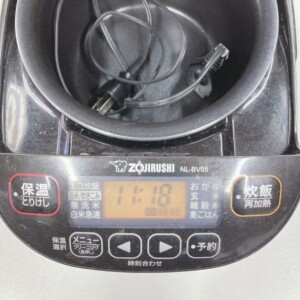 お預かりした炊飯器は、外装に使用に伴うスレや水垢跡が見られ、全体的に使用感のある状態でした。操作パネルの表示は問題なく、炊飯・保温・予約などの各機能も正常に動作しています。内釜はコーティングの剥がれは見られないものの、細かな使用跡が確認できました。内ぶたや蒸気口周辺には若干の汚れがありましたが、破損や欠品はなく、電源コードも付属しています。