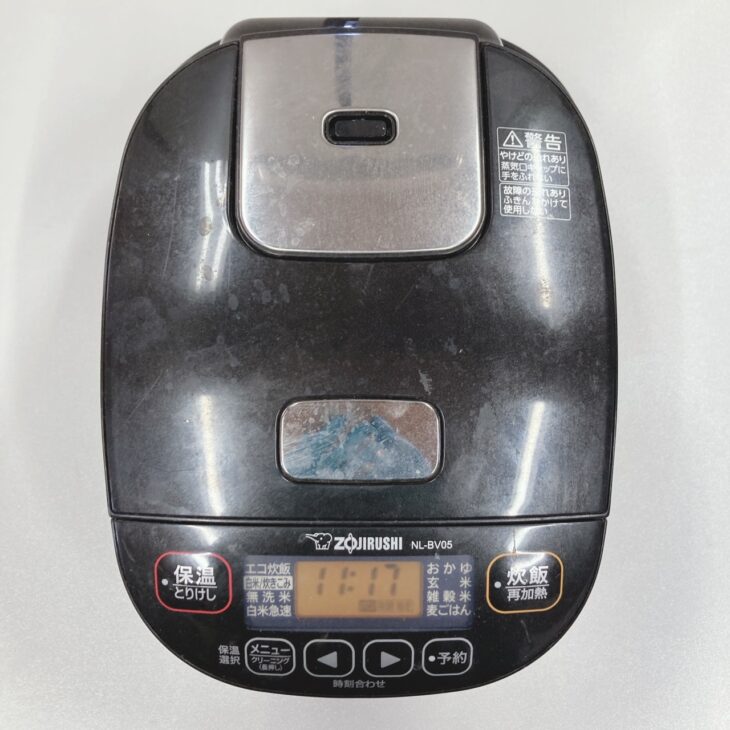 お預かりした炊飯器は、外装に使用に伴うスレや水垢跡が見られ、全体的に使用感のある状態でした。操作パネルの表示は問題なく、炊飯・保温・予約などの各機能も正常に動作しています。内釜はコーティングの剥がれは見られないものの、細かな使用跡が確認できました。内ぶたや蒸気口周辺には若干の汚れがありましたが、破損や欠品はなく、電源コードも付属しています。