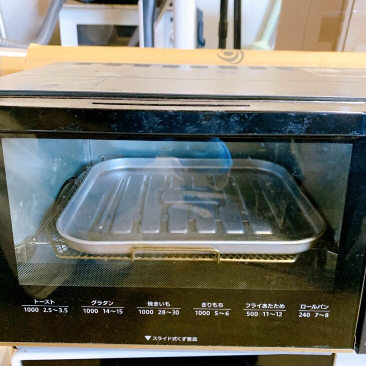 お引き取りしたオーブントースターは、通電および加熱動作に問題はなく、基本的なトースト・温め機能は正常に動作していました。ただし外観全体には日常使用による擦れや汚れの付着が見られ、庫内についてもパンくずや焦げ付き、使用による汚れが目立つ状態でした。付属品のトレーは揃っており、欠品はありませんが、全体として使用感はやや強めの印象です。