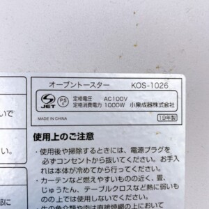 KOS-1026は小泉成器製のシンプルなオーブントースターで、一定の中古需要があります。ただし2019年製である点や、庫内の焦げ・汚れ、付属品の一部欠品を考慮しました。中古市場での取引相場と再販時の清掃コストを踏まえ、総合的に判断した結果、今回は300円での査定価格をご提示しました。当社では自社整備・販売ルートを活かし、他社よりも再販コストを抑えられるため、この価格での買取が可能となっています。