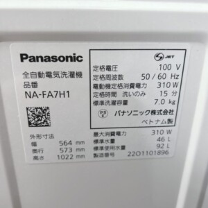 神奈川県川崎市高津区へ出張買取 Panasonic 全自動電気洗濯機 NA-FA7H1 ホース付き 外観は使用感少々あるが良好なため状態を踏まえて査定しました