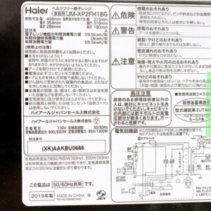 今回は相模原市中央区にお住まいの40代男性・会社員・単身世帯・賃貸(アパート)のお客様より、Haier(ハイアール)電子レンジ JM-XP2FH18G(2019年製)を出張買取にてご依頼いただきました。引っ越しに伴い、長年使用していた家電の整理としてご相談をいただいています。
