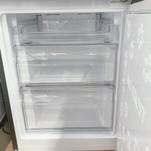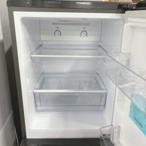 本体外観は目立つ傷やへこみは見られず、全体的にきれいな状態でした。ブラックカラーの前面パネルも艶が保たれており、使用感は比較的少なめです。庫内についても棚・引き出し・ドアポケットがすべて揃っており、割れや欠けは確認されませんでした。冷蔵室・冷凍室ともに汚れや臭い残りは少なく、清潔感のある状態で、冷却動作も問題なく確認できています。