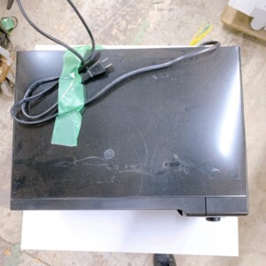 動作確認では通電・加熱ともに問題なく、基本機能は正常に動作していました。外観については、天面に擦れや細かな傷、使用に伴う汚れが確認でき、前面ドアにも軽度の使用感が見られます。一方で操作ダイヤルや表示部に破損はなく、庫内も焦げ付きや強い臭い残りは少なめで、日常使用には支障のない状態でした。電源コードも付属しており、欠品はありません。