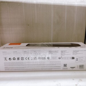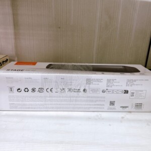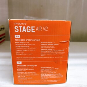 お預かりしたCreative STAGE AIR V2は、本体に目立つ傷や割れは見られず、通電・音出し・Bluetooth接続ともに正常動作を確認しました。一方で、外箱には保管時に生じた擦れやテープ補修跡、角の潰れが見られました。付属品についてはUSBケーブルが揃っており、使用には支障のない状態でした。