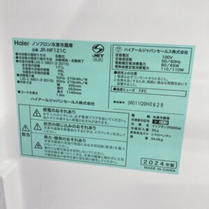 今回は福島県西白河郡西郷村にお住まいの30代女性・会社員・単身世帯のお客様より、Haier(ハイアール)ノンフロン冷凍冷蔵庫 JR-NF121C(2024年製)の出張買取をご依頼いただきました。