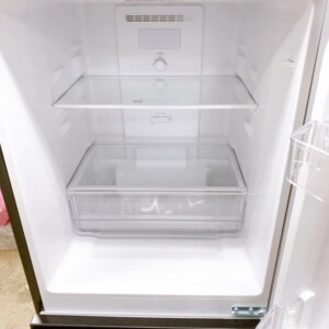 お引き取りした冷蔵庫は、外装に目立つへこみや大きな傷は見られず、全体的に落ち着いた印象のシルバーカラーが保たれていました。表面には使用に伴うごく軽微なスレが確認できましたが、近くで見て分かる程度です。庫内はガラス棚・野菜ケース・冷凍室ケースともに割れや欠けはなく、汚れやにおい残りもほとんどありませんでした。通電確認後の冷却動作や温度調整ダイヤルの反応も問題なく、日常使用に支障のない状態でした。