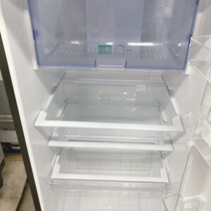 お引き取りした冷蔵庫は、外装がステンレス調のシルバーカラーで、正面・側面ともに目立つへこみや深い傷は確認できませんでした。使用に伴うごく軽微なスレは見られるものの、全体として落ち着いた印象です。庫内は棚板・ケース類がすべて揃っており、割れや欠けもなく清潔感のある状態でした。冷却動作や庫内ファンの動作も問題なく、日常使用に支障のないコンディションです。