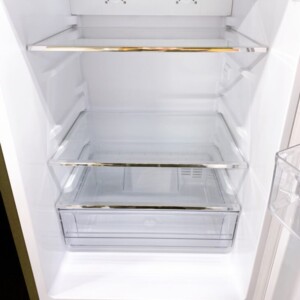 お引き取りした冷蔵庫は、ステンレス調シルバーカラーの外観で、目立つ傷やへこみは確認できませんでした。表面には保管や設置に伴うごく軽微なスレが見られる程度で、全体的に使用感は少なめです。庫内はガラス棚・ケース類がすべて揃っており、割れや欠け、汚れの付着もほとんどない清潔な状態でした。冷却動作や庫内温度の安定性も確認でき、問題なく使用できるコンディションです。