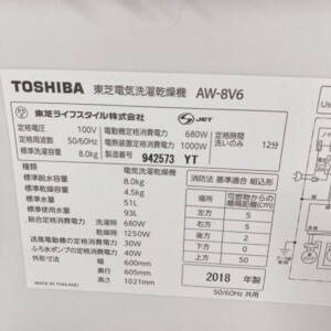 福島県大熊町へTOSHIBA ZABOON 洗濯乾燥機 AW-8V6 2018年製 出張買取