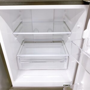 お引き取りした冷蔵庫は、外観に目立つへこみや大きな傷は見られず、全体的に落ち着いた使用状態でした。庫内についても棚板やケースに割れはなく、清掃が行き届いたきれいな状態を保っていました。冷蔵室・冷凍室ともに通電後の冷却動作を確認し、正常に稼働することを確認しています。付属の棚や引き出しもすべて揃っていました。