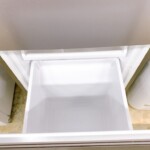 お引き取りした冷蔵庫は、外観に目立つへこみや大きな傷は見られず、全体的に落ち着いた使用状態でした。庫内についても棚板やケースに割れはなく、清掃が行き届いたきれいな状態を保っていました。冷蔵室・冷凍室ともに通電後の冷却動作を確認し、正常に稼働することを確認しています。付属の棚や引き出しもすべて揃っていました。