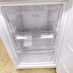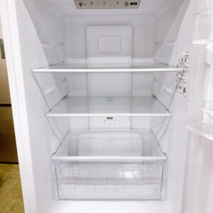 拝見した冷蔵庫は外観・庫内ともに比較的きれいな状態でした。ガラス棚や野菜ケース、冷凍室の引き出しなど付属品も一通り揃っており、通常使用による軽微なスレは見られるものの、目立つ傷や破損は確認されませんでした。冷却動作も問題ありませんでした。
