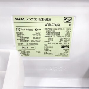 今回は福島県中島村にお住まいの30代女性・主婦・親子世帯のお客様より、AQUA ノンフロン冷凍冷蔵庫 AQR-27K(S)(2021年製)を出張買取にてご依頼いただきました。