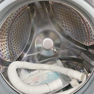 ドラム内部はステンレス槽に大きな汚れやサビは確認されず、使用感はあるものの丁寧に使われていた印象です。給排水ホースや説明書類も揃っており、洗濯・脱水・乾燥の各動作確認も問題なく行えました。
