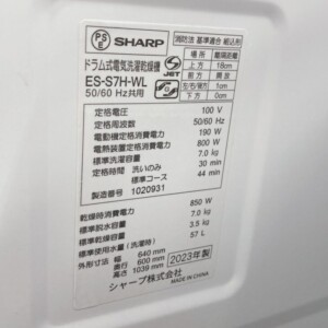 SHARPのES-S7H-WLは、コンパクト設計ながら洗濯7kg対応の人気ドラム式モデルで、中古市場でも安定した需要があります。2023年製と比較的新しく、状態が良好だった点を高く評価しました。