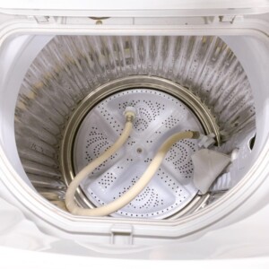 洗濯槽内部には使用感がはっきりと分かる汚れの付着があり、乾燥経路周辺にも経年使用による変色が見受けられる状態でした。一方で、洗い・すすぎ・脱水・乾燥の各動作は正常に確認でき、給水ホースも付属していました。