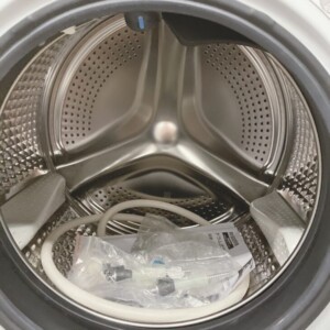 ドラム内部も清潔な状態が保たれており、カビ臭や強い汚れの付着はありませんでした。洗濯・脱水・乾燥といった基本動作はすべて正常に確認できています。付属品として給水ホース・排水ホース・取扱説明書が揃っていた点も評価対象となりました。