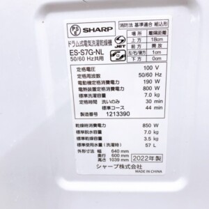 お預かりしたES-S7G-NLは、外観全体に使用に伴う汚れや擦れが見られ、操作パネル周辺にも日常使用によるくすみが確認できました。大きな割れや致命的な破損はなく、本体としての使用は可能な状態です。ドラム内部にも使用による軽度の汚れが見られましたが、強いカビ臭や異音はなく、洗濯・脱水・乾燥といった基本動作はすべて正常に確認できています。付属品としてホースが揃っていました。