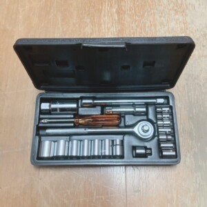お預かりしたソケットレンチセットは、ハードケースに擦れや小キズが見られ、外箱も角に擦れがあるなど使用感が確認できました。 一方で、ケース内部の工具は大きな欠品がなく、ラチェットハンドル・エクステンション・各種ソケットが揃っている状態でした。 金属部には保管に伴う細かな曇りはあるものの、著しいサビや割れ、破損は見受けられず、実用面では十分使用可能と判断しました。