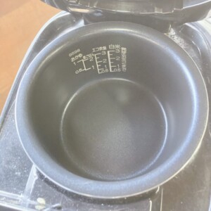 お預かりした炊飯器は、外装に細かなスレや使用に伴う汚れが見られ、全体として使用感のある状態でした。内釜についてはコーティングの大きな剥がれはなく、炊飯目盛りもはっきり確認できました。通電・炊飯動作を確認したところ、基本動作に問題はありませんでした。