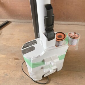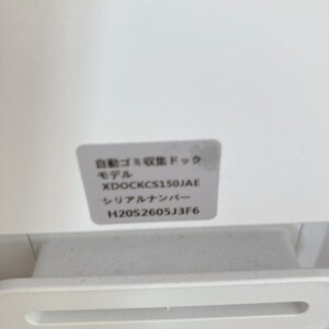 本体は屋内使用のみで、外装に大きな傷や割れは見られませんでした。ダストカップやヘッド部分も清掃されており、動作確認も問題なく良好です。フィルターは予備を含めて付属しており、自動ゴミ収集ドック(型番:XDOCKCS150JAE)も揃った状態でした。
