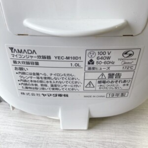 YEC-M10D1は最大炊飯容量1.0Lの単身~少人数向けモデルとして実用性はあるものの、2019年製で製造から5年以上が経過している点を考慮し、当社基準により買取価格は0円と判断しました。ただし、今回は他の家電とあわせてのご依頼であったため、無料引き取り対応としてお受けしています。