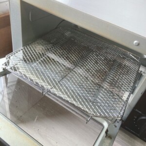 本体外観は目立つへこみや破損はなく、全体的に落ち着いた状態でした。庫内には使用に伴う軽い汚れや焼き網の使用感が見られましたが、通電確認を行い、加熱・タイマー操作など基本動作は問題なく確認できています。