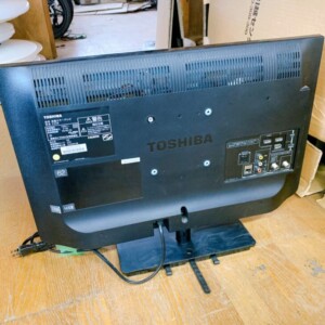 お引き取りした液晶テレビは、電源投入後の起動、映像表示、音声出力ともに問題なく動作している状態でした。画面には大きな割れや表示不良は見られず、視聴自体には支障のないコンディションです。一方で、筐体背面やスタンド部分には経年使用による擦れやホコリの付着が確認できました。付属品は純正リモコンと電源コードが揃っている状態でした。