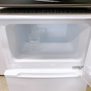 拝見した冷凍冷蔵庫は、外装に目立つへこみや大きな傷はなく、全体的に使用感の少ない状態でした。庫内も清潔に保たれており、棚板・ドアポケット・冷蔵室下段ケースなどの付属パーツも揃っています。通電確認後、冷蔵・冷凍ともに冷却動作は良好で、異音や結露も見られませんでした。