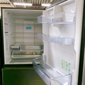 本体外観はシルバー系カラーで、正面・側面ともに目立つ凹みや大きな傷はなく、日常使用に伴う細かな擦れが見られる程度でした。庫内は棚・ケース・ドアポケット類がすべて揃っており、欠品や破損は確認されませんでした。冷却動作、庫内灯、操作パネルの反応も問題なく、冷蔵・冷凍ともに正常に稼働している状態でした。