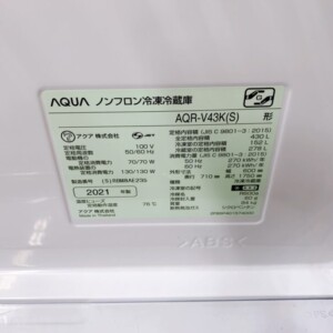 今回は福井県勝山市にお住まいの40代・男性・会社員・夫婦世帯・持ち家(一戸建て)のお客様より、AQUA ノンフロン冷凍冷蔵庫 AQR-V43K(S)(2021年製)を出張買取にてご依頼いただきました。