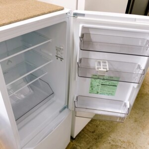 庫内も棚・ドアポケット・ケース類がすべて揃っており、冷却動作・庫内灯・引き出しの開閉なども問題なく確認できました。異音や冷えムラもなく、使用状況は良好でした。