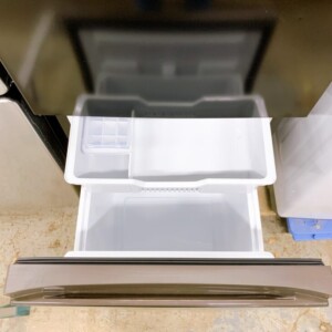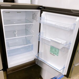 お引き取りした冷蔵庫は2023年製で、通電確認を行い冷蔵・冷凍ともにしっかり冷えることを確認しました。外観はブラックカラーで、目立つへこみや大きな傷は見られず、使用に伴うごく軽微な擦れがある程度です。庫内は棚やドアポケット、冷凍室ケースが揃っており、汚れやニオイも少なく、全体的にきれいな状態でした。