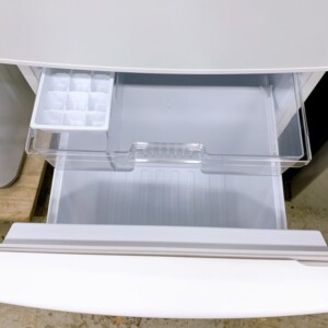 本体の外観は目立つ傷やへこみがなく、全体的にきれいな状態でした。庫内も清潔感が保たれており、棚・ドアポケット・冷凍室ケース・製氷皿などの付属品も揃っていることを確認しています。冷蔵・冷凍ともに動作確認を行い、冷却性能や異音の有無なども問題ありませんでした。