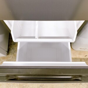 本体外観は目立つ傷やへこみがほとんどなく、全体的にきれいな状態でした。庫内も清潔感が保たれており、棚・ドアポケット・野菜ケース・冷凍室トレーなどの付属パーツが一通り揃っていることを確認しています。冷蔵・冷凍ともに動作確認を行い、冷却性能や異音の有無についても問題は見られませんでした。