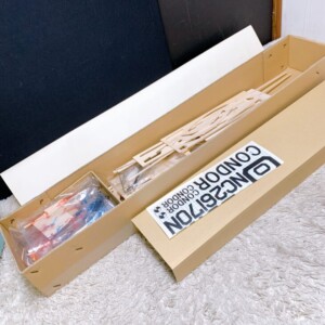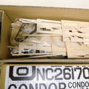 お預かりした商品は未組立のキット状態で、バルサ材、機体構造用パーツ、ステッカー類が確認できました。外箱には保管に伴う軽度のスレや角のつぶれが見られましたが、主要部材に割れや欠品はなく、組み立てに支障のない内容でした。未組立である点は査定時の重要な評価ポイントとなっています。