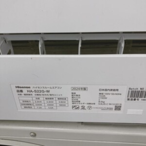 今回は福島県葛尾村にお住まいの40代男性のお客様より、ハイセンス ルームエアコン(HA-S22G-W・2024年製)の出張買取をご依頼いただきました。設置後まもないエアコンで、冷房・暖房ともに使用頻度が少なく、付属のリモコンも揃った状態でした。