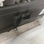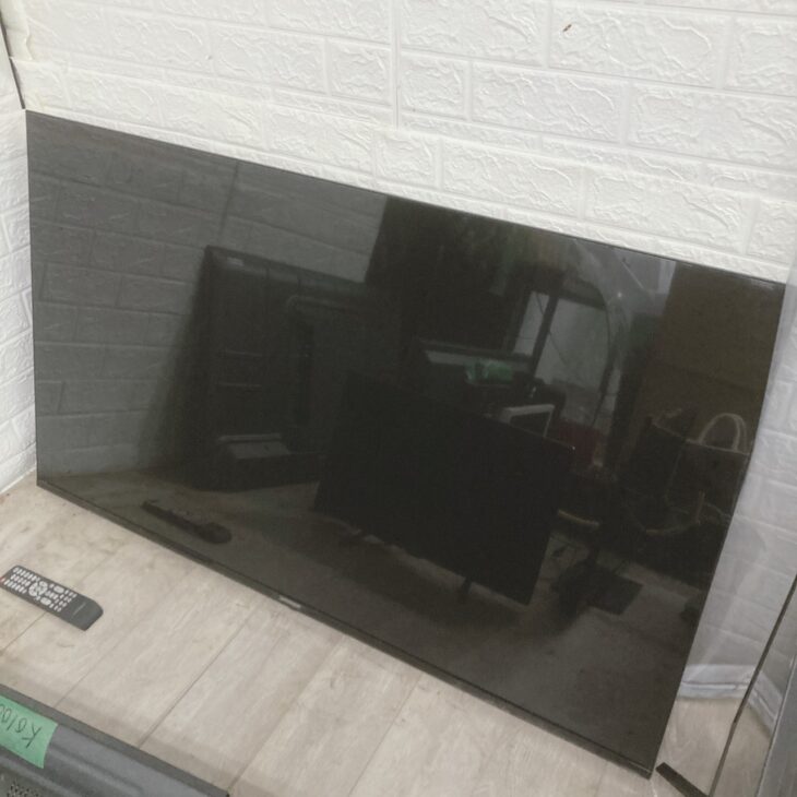 お預かりした55型液晶モニターは、画面に割れや表示不良は見られず、通電および映像出力も問題なく確認できました。液晶表面には使用に伴う細かな拭き跡や軽度のスレが見受けられましたが、視聴時に大きく気になるものではありません。背面には壁掛け金具が取り付けられており、付属品としてリモコンと電源ケーブルが揃っていました。