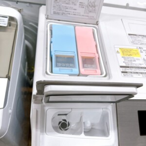 本体外観は目立つ傷や大きなへこみは見られず、全体的に清潔感のある状態でした。ドアパッキン部分に劣化はなく、ドラム内部もサビや強い汚れは確認されません。洗剤・柔軟剤の自動投入ケースも比較的きれいで、固着や詰まりはありませんでした。通電確認のうえ、洗い・脱水・乾燥の各工程が正常に動作することを確認しています。