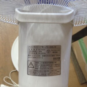 お預かりしたLFD-306L-Wは、外観に細かな擦れが見られたものの、スタンド部や支柱に大きな割れ・欠けはありませんでした。操作部は通電確認ができ、風量切替・タイマー機能・首振り動作も問題なく動作しました。羽根ガードには保管に伴う軽いホコリの付着がありましたが、落としやすい範囲で、致命的な汚れやニオイ移りは確認されませんでした。
