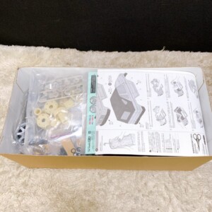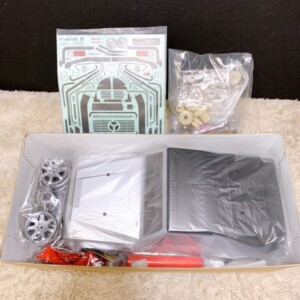 お送りいただいた商品は、外箱に保管に伴う軽い角擦れが見られたものの、内容物は未組立の状態で保管されていました。ボディパーツ、シャーシパーツ、ホイール、ギア類、ステッカー、組立説明書などが揃っており、袋も開封されていないパーツが多く見受けられました。