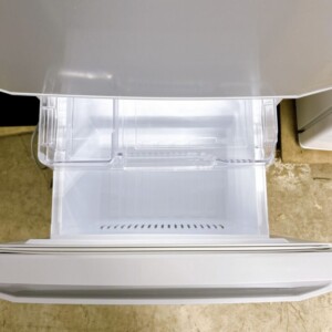 お引き取りした冷蔵庫は、外観に目立つへこみや大きな傷は見られず、全体的に清潔感のある状態でした。扉の開閉はスムーズで、パッキン部分の劣化も目立ちません。庫内は棚・ドアポケット・引き出しケースまで揃っており、使用感はあるものの汚れやニオイ残りは少ない印象です。通電後の冷却確認では、冷蔵・冷凍ともに問題なく動作していることを確認しました。