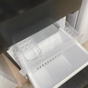 お引き取りした冷蔵庫は、外観に目立つへこみや大きな傷は見られず、全体的に使用感の少ない状態でした。扉の開閉も問題なく、パッキンの浮きや劣化も確認されていません。庫内についても棚板・クリアケース・引き出し類がすべて揃っており、汚れやニオイ残りもほとんどない清潔な状態でした。通電確認では、冷蔵・冷凍ともにしっかり冷却されていることを確認しています。