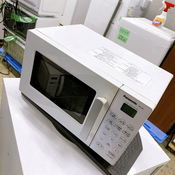 拝見したPanasonic NE-KA1-Wは、本体外装に目立つ大きなへこみや破損はなく、通常使用による細かな擦れや軽度の汚れが見られる状態でした。庫内は加熱による焦げ跡や食品カスが若干残っていましたが、動作確認ではレンジ加熱・グリル機能ともに問題なく稼働しました。ターンテーブル皿や付属パーツも揃っており、再販可能なコンディションを維持している製品でした。