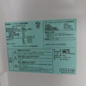 今回は福島県棚倉町にお住まいの20代男性・学生・単身・賃貸(アパート)のお客様より、Haier ノンフロン冷凍冷蔵庫 JR-NF121B(2024年製)を出張買取にてご依頼いただきました。