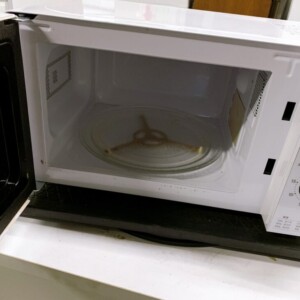 お預かりした電子レンジは、外観については目立つ割れや大きなへこみはなく、全体として一般的な使用状態でした。一方で、庫内のガラステーブルには加熱時の吹きこぼしによる焦げ付きや変色跡が見受けられました。